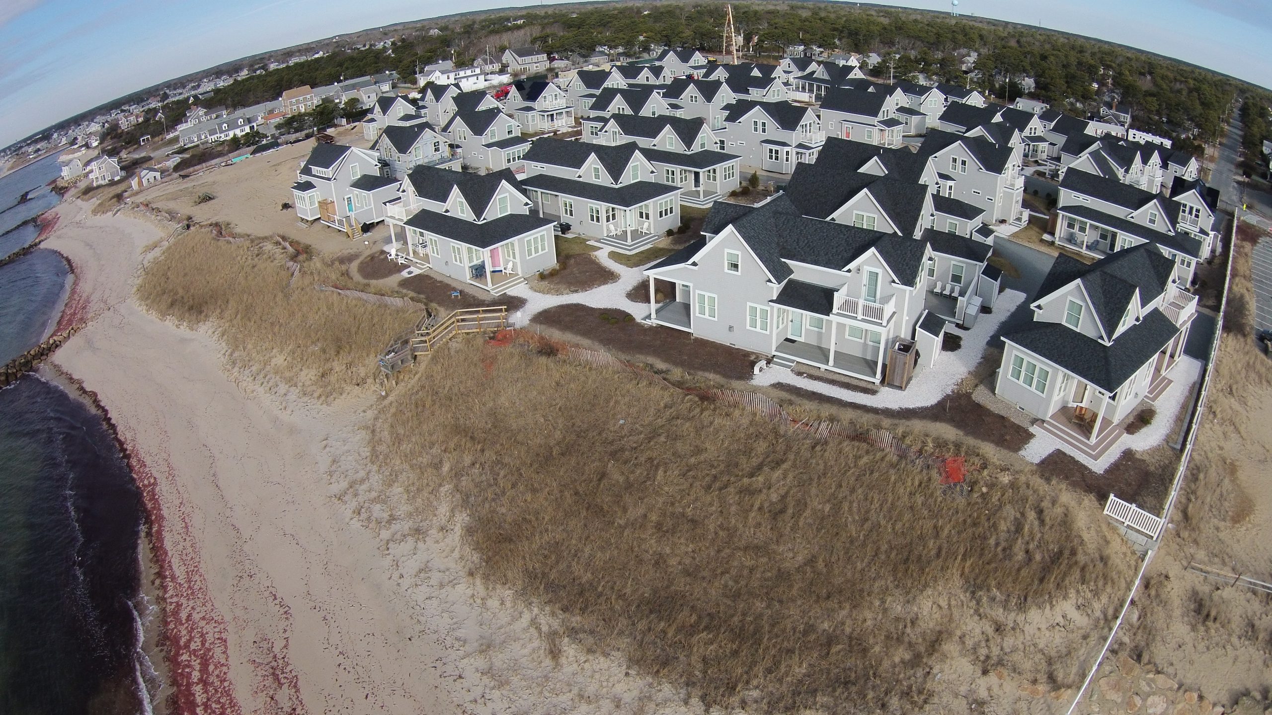 Aerial shot of Cape Cod coastal homes